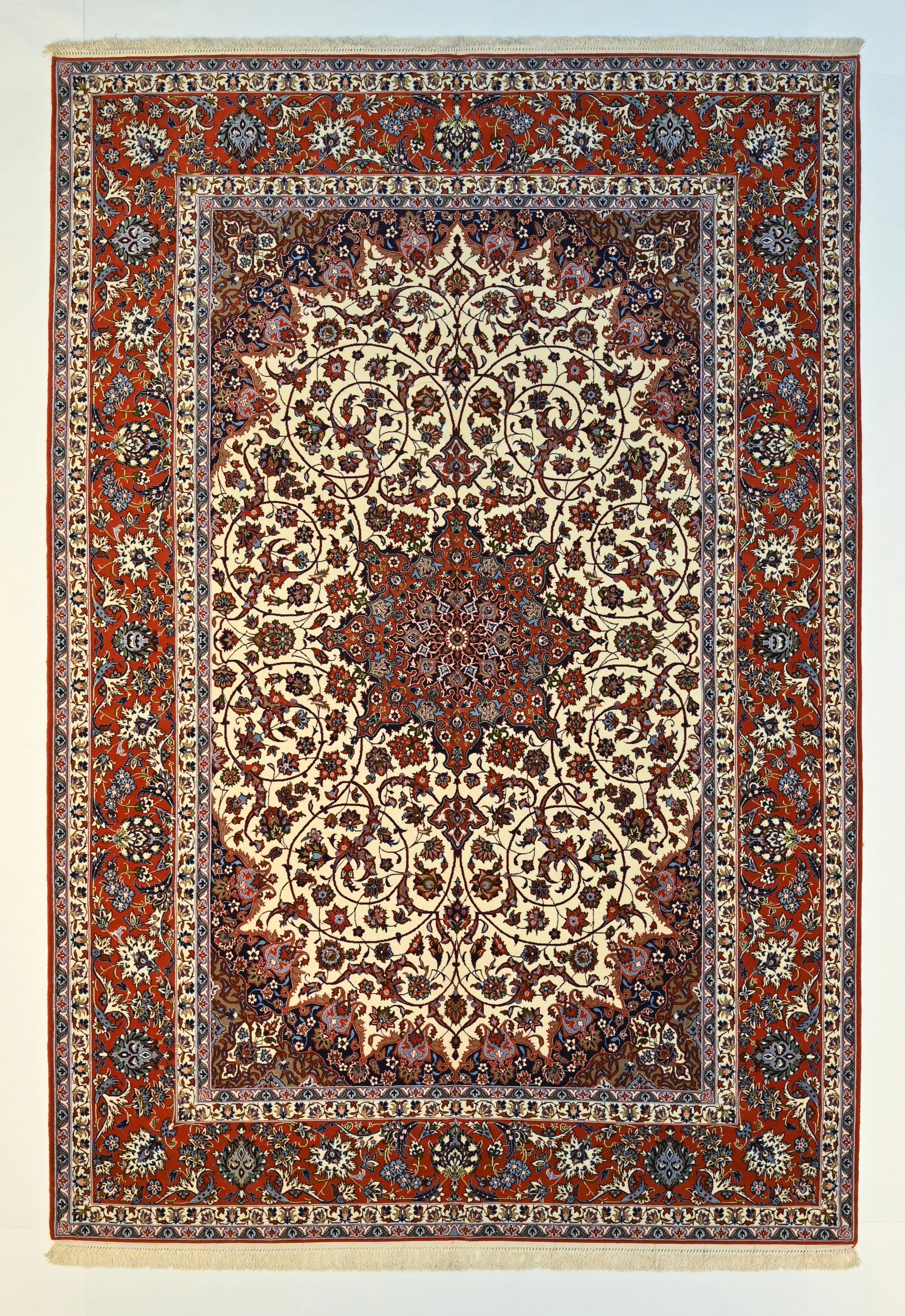 It is hard to imagine a weaver could achieve such synchrony between eyes, mind, and muscles. In a case as the carpet here, the weaver has made close to four million knots harmoniously to create almost perfect symmetry. Isfahan. Circa 1980s.